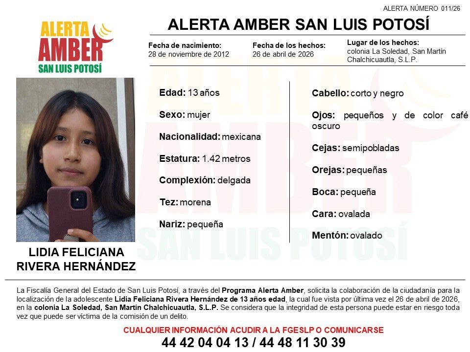 FGESLP INICIA ALERTA AMBER PARA LOCALIZAR A ADOLESCENTE DE 13