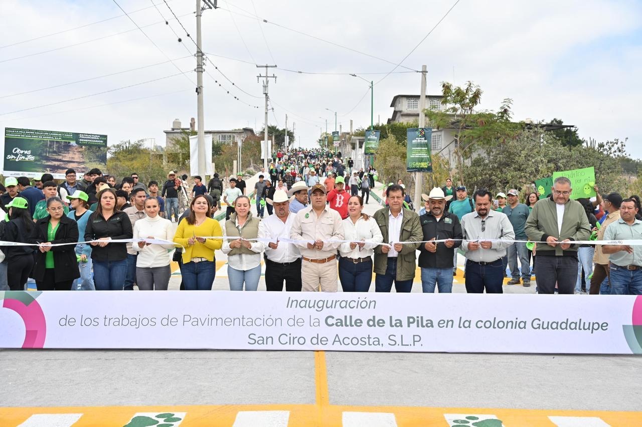 En el municipio de San Ciro de Acosta, el mandatario inauguró la pavimentación de la calle La Pila, en la colonia Guadalupe, que conduce al paraje turístico de El Cristo. La obra contempló la construcción de 3 mil 300 metros cuadrados de concreto hidráulico, así como banquetas y alumbrado público, lo que beneficiará a más de 700 familias de la zona. Durante el acto, anunció además la construcción de la carretera a Palo Alto y la ampliación de la misma vialidad hasta el entronque con la carretera estatal.